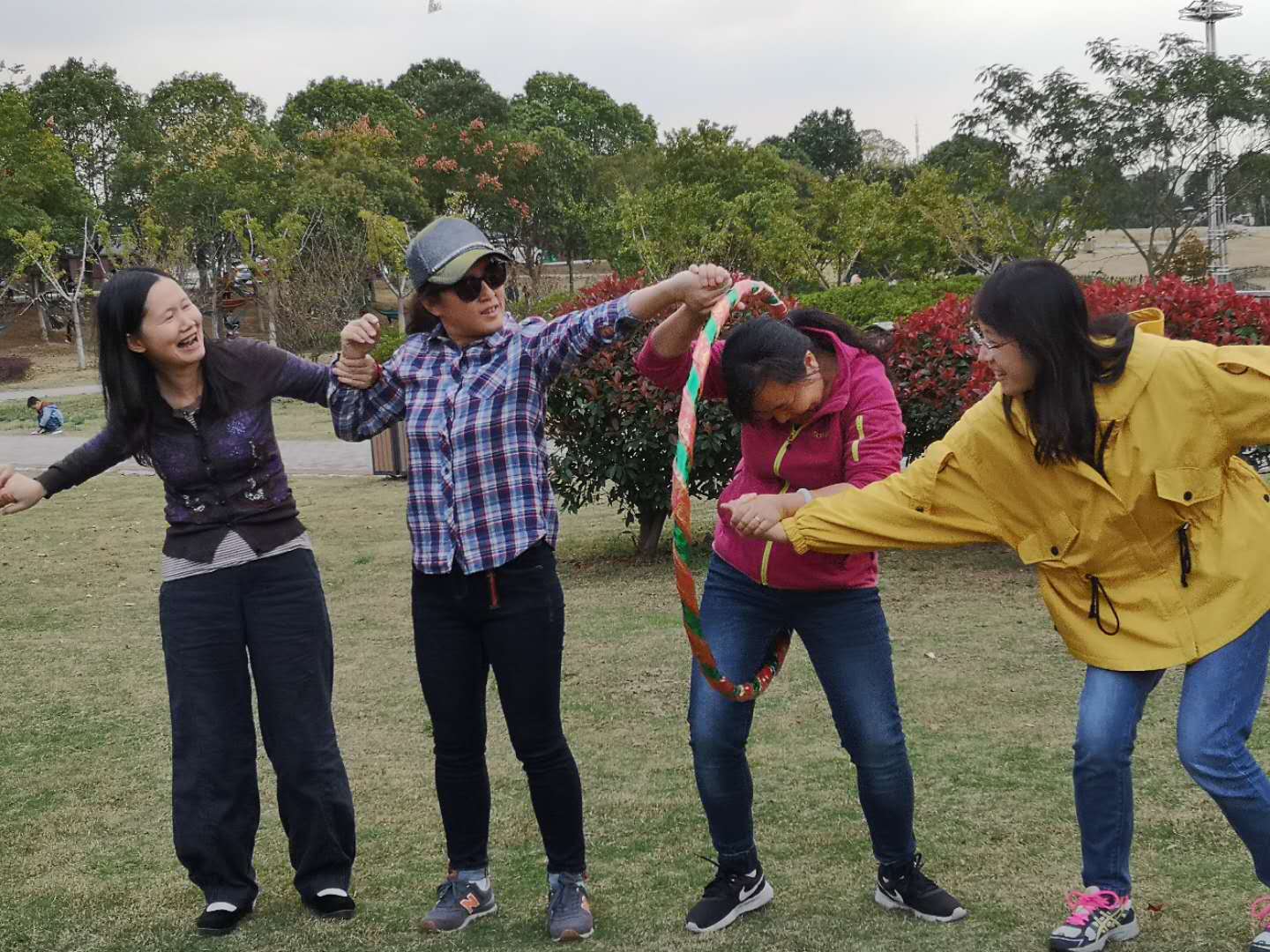 在“一圈到底”活动中,全院教师分为四组,每组8名队员,队员们手牵着手成一排站立,依次穿过同一个呼啦圈,在传递过程中,始终不能松开牵着的双手。经过三轮激烈的角逐,冠军队伍以默契的配合胜出。大桥过河活动更是收获了很多欢乐。自由组合的4人小队为参赛单位,每队使用纸板作为“渡河”的工具。有的队伍收放纸板整齐划一,有的队伍则状况频出,笑声不断。