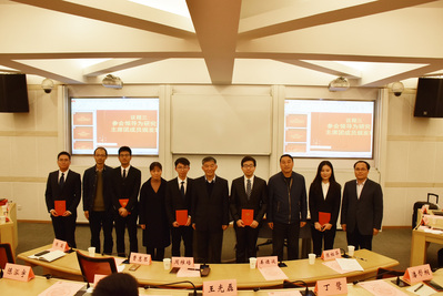 参会领导为政府审计在线博彩平台 研究生会主席团成员颁发聘书并合影。