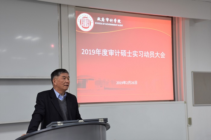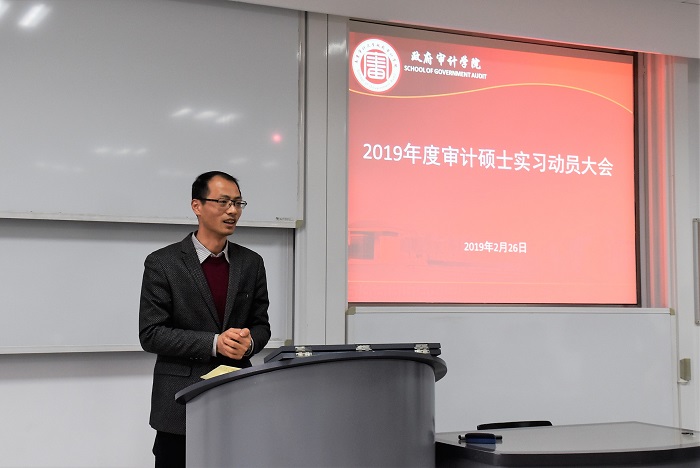 2019年2月26日,政府审计在线博彩平台 于敏行208召开了2019年度审计硕士实习动员大会。南京审计大学党委副书记、副校长王会金教授出席了此次动员大会,会议由政府审计在线博彩平台 执行院长陈骏教授主持。