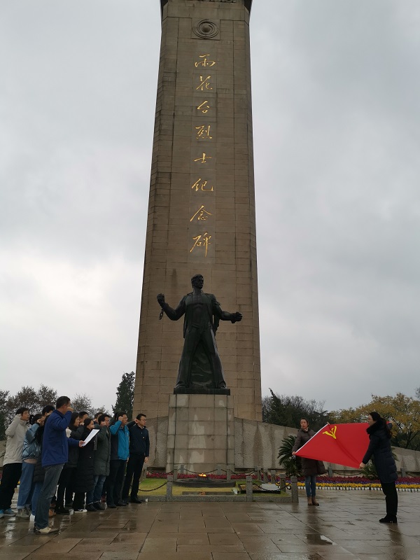 雨花台是新民主主义革命时期中国共产党人和爱国志士最集中的殉难地。1927-1949年,在争取民族独立、人民解放的历史进程中,许多中华民族的优秀儿女,在这里壮烈地倒下,用生命为新中国的诞生铺平了前进的道路。先烈们来自全国20多个省市,多数出身于富裕家庭受过良好的教育,其中不乏留洋的博士。他们牺牲时大多很年轻,平均年龄不足30岁,最小的才16岁。在革命征途中,他们无论身在何时何地,无论顺境还是逆境,无论面对威逼还是利诱,始终忠诚如一,宁死不屈,气贯长虹。他们身上闪耀着理想的光芒,体现着信念的力量,散发着人格的魅力。烈士纪念碑前,在党总支副书记祝遵宏的带领下,党员同志们面对党旗,重温入党誓词。“为共产主义奋斗终身,随时准备为党和人民牺牲一切,永不叛党”的声音回荡在纪念碑周围,党员们不忘初心、牢记使命,为实现中华民族伟大复兴的中国梦而努力奋斗,才是对先烈英魂的告慰。