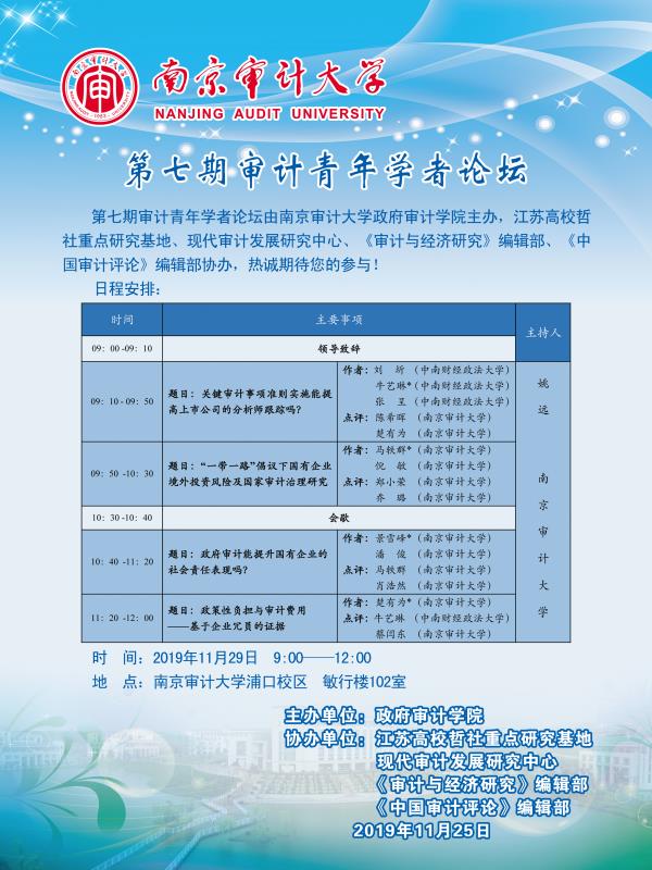 第七期审计青年学者论坛,第七期审计青年学者论坛有南京审计大学政府审计在线博彩平台 主办,江苏高校哲社重点研究基地、现代审计发展研究中心、《审计与经济研究》编辑部、《中国审计评论》