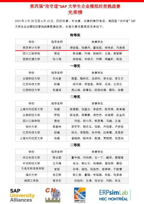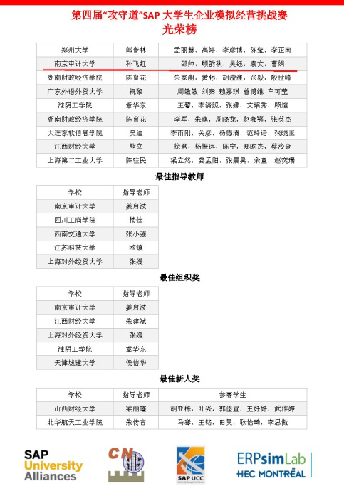 “攻守道” SAP大学生企业模拟经营挑战赛是由国际信息系统学会中国分会(CNAIS)和SAP大学联盟主办,北京交通大学承办的面相全国高校在校学生的商业模拟竞赛,旨在参赛学生能够在企业真实的管理系统中模拟企业运营,鼓励学生在商业流程与企业管理方面进行大胆探索,培养一批财会专业技能过硬,商业运营思维创新的未来人才。本届大赛吸引了全国34所高校,55支代表队参加。今年南京审计大学出征的两支队伍分别在全国练习赛、初赛、半决赛、总决赛阶段,和中央财经大学、上海对外经贸大学、江西财经大学、广东外语外贸大学等高校同台竞技,相互切磋,最终我校“谢广坤后援团”代表队取得总决赛全国第一名的好成绩;“与你有瓜”代表队也表现不俗,荣获大赛三等奖。