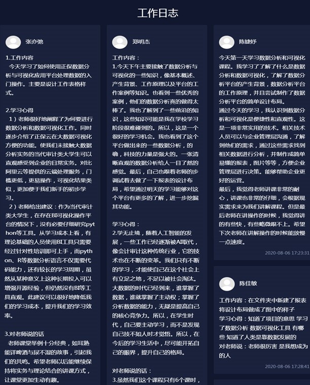 通过从票据认知到独立完成开票、录入凭证、查账、报表、报税等一系列动手操作,同学们将日常所学的理论知识运用到实践中,体验了企业实际会计岗位的工作流程,同时通过随堂测验让能力掌握地更扎实。从同学们每天提交的工作日志中也可以发现,大家对数据分析实务知识的渴望和学习热情,许多同学还提出了自己对数据分析平台的独到见解。