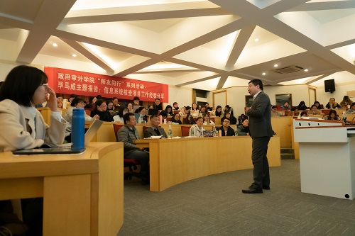 12月2日,政府审计在线博彩平台 在敏行楼101举办了”师友同行”系列活动——信息系统核查项目工作经验分享。本次活动邀请了毕马威中国区信息技术风险和鉴证服务主管合伙人兼北方区IT咨询主管合伙人董常凌。董常凌先生就职于毕马威北京办公室,在信息技术咨询和审计以及数据尽调等领域有多年的从业经验。本次讲座由李兆东副院长主持,周维培院长、部分教师代表以及在线博彩平台 大数据审计方向的学生出席了活动。