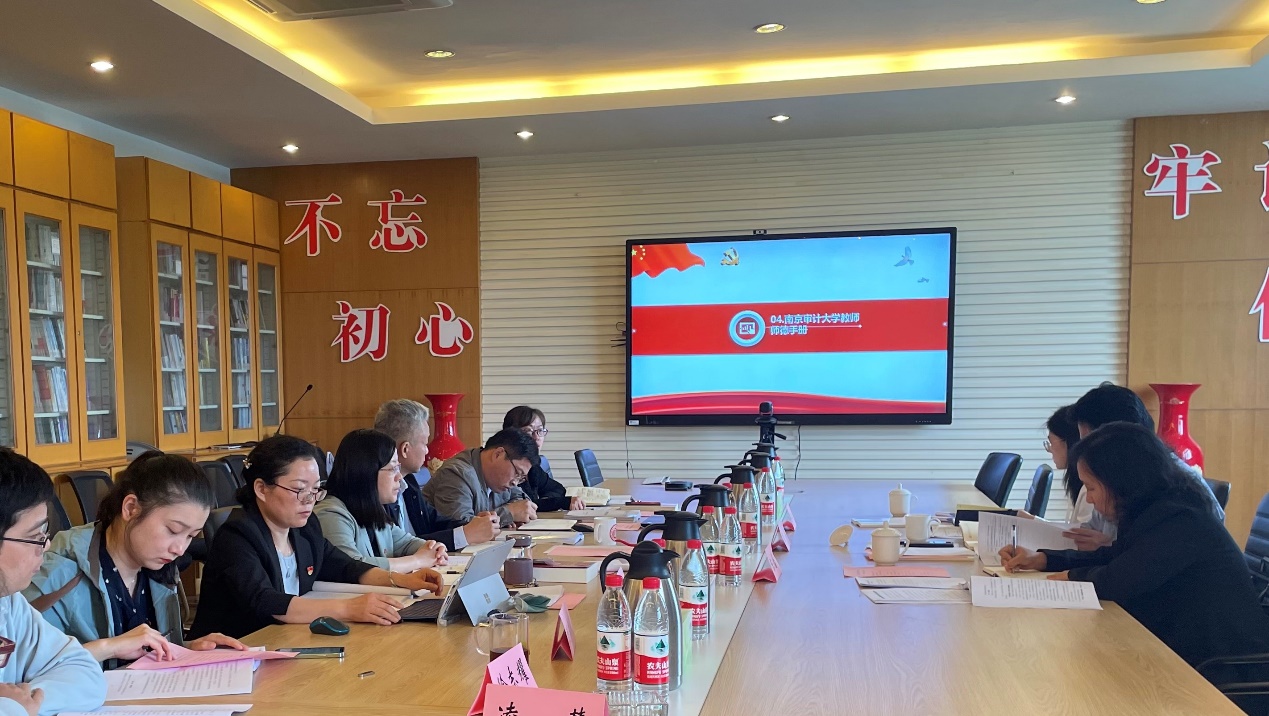 教工第一党支部书记贾云洁发言说,新时代的审计教育面临着改革创新的压力,知识快速迭代的压力,使得教师的转型、终身学习压力加大,师德师风建设任务重。教师需要提升教学胜任能力,以适应新时代教育发展的新格局。教工第三党支部书记陈艳娇说,作为新时代的南审审计专业教师,不仅要做好自身的教学科研工作,站好三尺讲台,成为学生喜爱的教师,科研的排头兵;更应学会在教授知识的同时,做好科研的能力传授工作。教工第四支部书记徐志耀认为,好教师应有扎实的学识和仁爱之心,不以学习成绩作为评判学生的唯一标准,关心和帮助每一位学生。