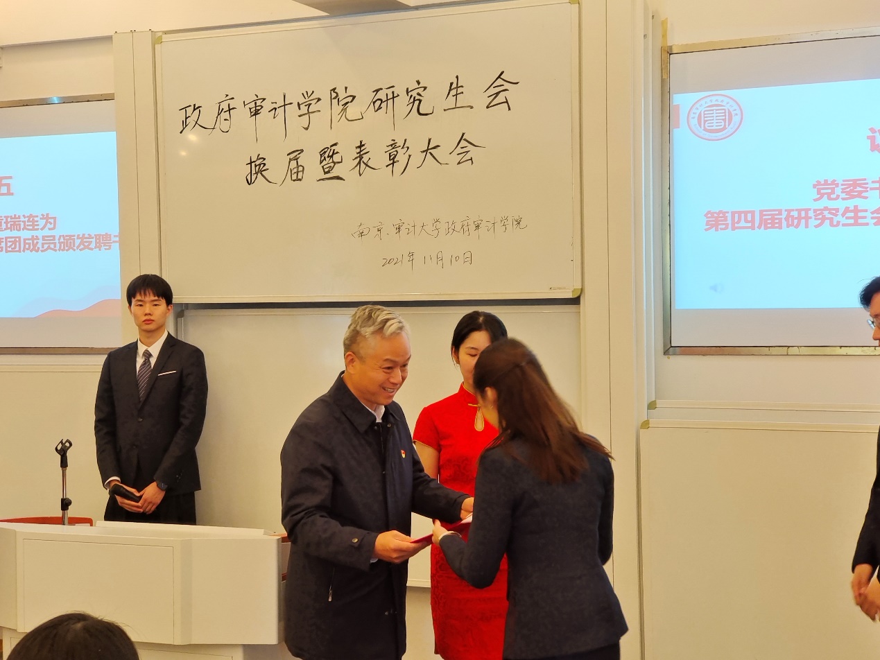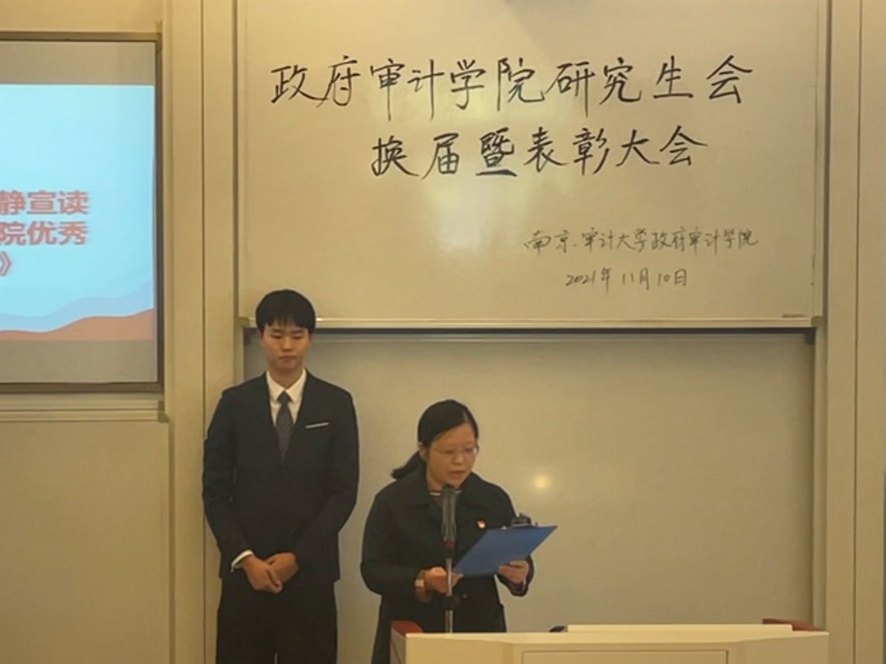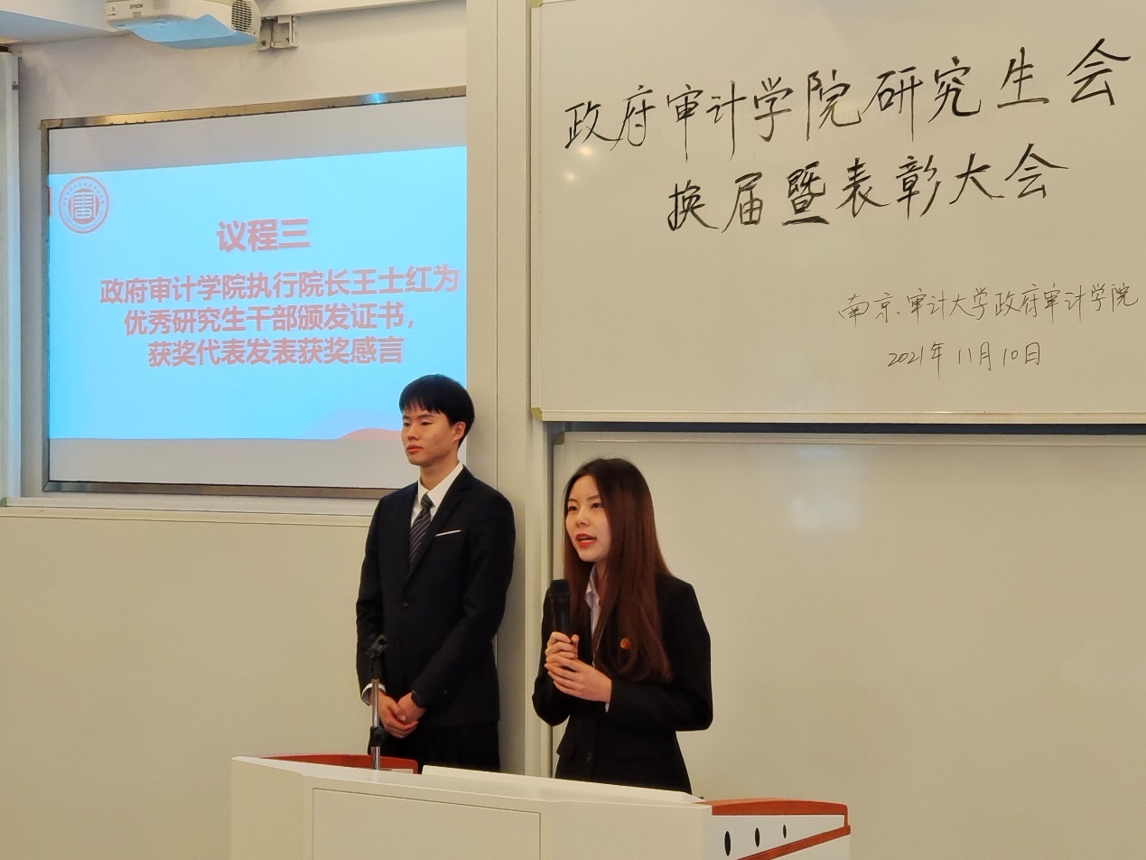 2021年11月10日,南京审计大学政府审计在线博彩平台 研究生会换届暨表彰大会在敏行楼101顺利召开。