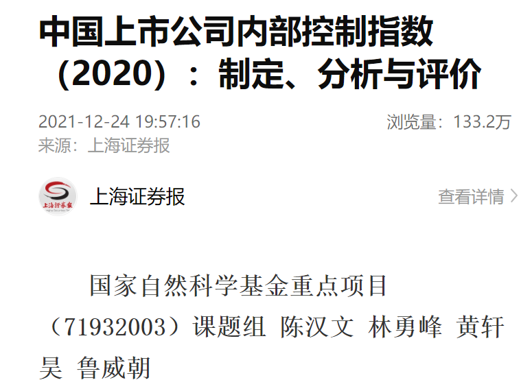 除学术论文外,陈汉文教授主持的国家自然科学基金重点项目课题组完成了《中国上市公司内部控制指数(2020):制定、分析与评价》研究报告。此次报告共涉及4231家披露2020年度报告的A股上市公司,涵盖主板、中小板、创业板和科创板,为进一步促进我国上市公司内部控制质量提升提供了重要参考依据。该报告于2021年12月24日刊登于《上海证券报》,并在新华社客户端进行同步推送,在线浏览量超过130万,得到了学界、业界以及政策界的广泛关注,在资本市场上取得强烈反响。