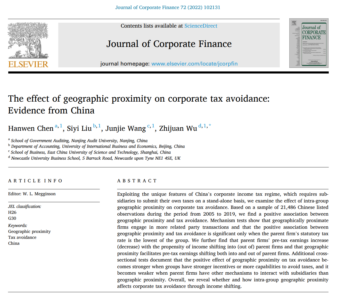 除此之外,陈汉文教授的合作论文“The effect of geographic proximity on corporate tax avoidance: Evidence from China”于近期被国际财务学权威期刊Journal of Corporate Finance(JCF)接受并在线发表。该期刊是公司财务领域的权威学术期刊之一,系JCR商学与财务学一区期刊,近5年的平均影响因子为6.088,旨在发表公司金融/公司财务、公司治理等领域的高质量理论与实证论文。