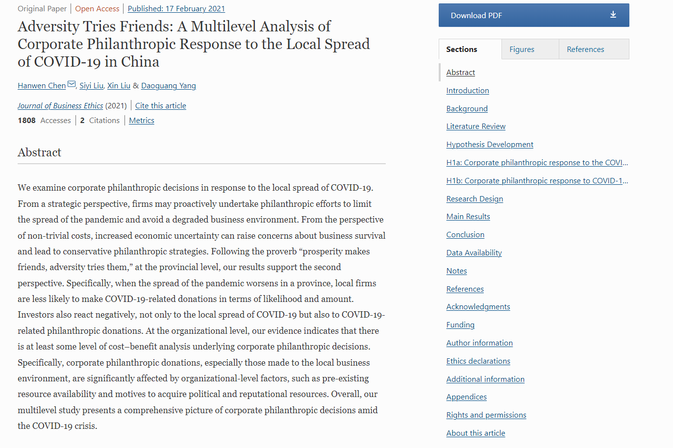 同时,陈汉文教授的合作论文“Adversity tries friends: A multilevel analysis of corporate philanthropic response to the local spread of COVID 19 in China”也于近期被国际知名期刊Journal of Business Ethics(JBE)接受并在线发表。该期刊是Financial Times金融时报认定的50本期刊之一(简称FT50),系JCR伦理类一区、商学类二区期刊,近5年影响因子为7.83。