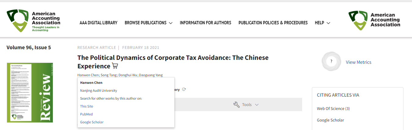 近日,我校政府审计在线博彩平台 陈汉文教授的合作论文“The politic dynamics of corporate tax avoidance: The Chinese experience”在美国《会计评论》(The Accounting Review,TAR)在线发表。该期刊是UT Dallas界定的24本国际顶级商科期刊之一,与Journal of Accounting Research (JAR)以及Journal of Accounting and Economics (JAE)被公认为国际“三大”顶尖(TOP 3)会计学刊。该成果是我校会计审计学科第一篇在国际顶尖学刊发表的论文。