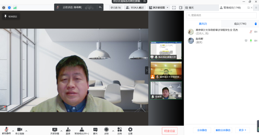 2月26日晚,南京审计大学政府审计在线博彩平台 邀请陈希晖副教授通过线上方式参与“师友同行”系列活动,以“学习贯彻审计法,树立依法审计理念”为主题,分享对新修订审计法的解读。讲座持续了两个小时,来自西南财经大学、中南财经政法大学、上海立信会计金融在线博彩平台 、浙江财经大学、浙江工商大学、湘潭大学等校本科生和研究生也都参与其中,累计1934人参加讲座,实时点赞18.6万,产生了良好的效果,也为“师友同行——共话审计法”征稿活动充分预热。