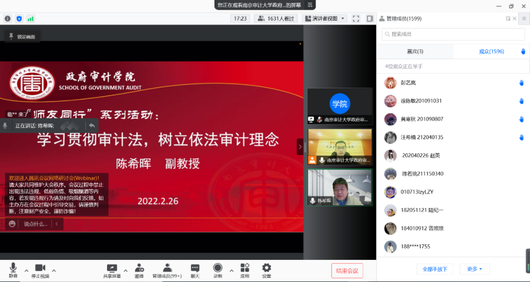 2月26日晚,南京审计大学政府审计在线博彩平台 邀请陈希晖副教授通过线上方式参与“师友同行”系列活动,以“学习贯彻审计法,树立依法审计理念”为主题,分享对新修订审计法的解读。讲座持续了两个小时,来自西南财经大学、中南财经政法大学、上海立信会计金融在线博彩平台 、浙江财经大学、浙江工商大学、湘潭大学等校本科生和研究生也都参与其中,累计1934人参加讲座,实时点赞18.6万,产生了良好的效果,也为“师友同行——共话审计法”征稿活动充分预热。