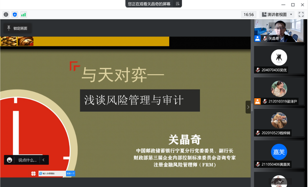 3月27日下午,政府审计在线博彩平台 在线上举行“师友同行”系列讲座——风险管理与审计。本次讲座邀请中国邮政储蓄银行关晶奇先生主讲,政府审计在线博彩平台 执行院长王士红教授主持,在线博彩平台 300多名师生在线聆听讲座。