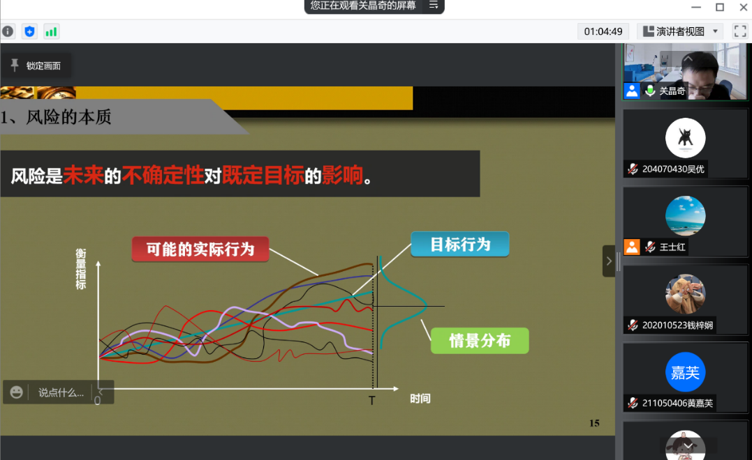 习近平总书记多次强调,要“坚持底线思维,增强忧患意识,提高防控能力,着力防范化解重大风险”,由此可见风险管理的重要性。既然管理风险如此重要,那么风险究竟是什么?关先生通过生动形象的图象向同学们描述了风险的定义是未来的不确定性对既定目标的影响。风险具有四个特性,分别为不确定性、未来性、目标性与双面性,其中风险的本质属性为不确定性。