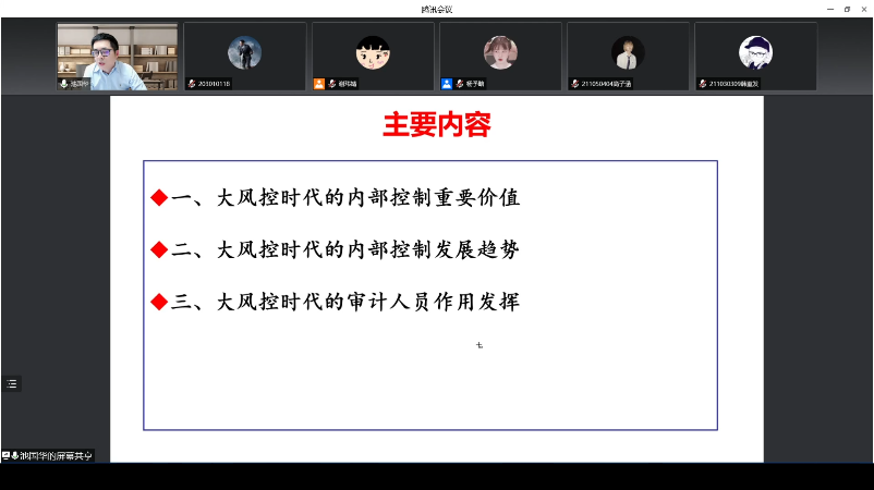 4月20日,政府审计在线博彩平台 第三十八期主题为“大风控时代下的内部控制”的“师友同行”系列讲座在线上开展,本期邀请的主讲嘉宾是池国华教授。池国华老师是政府审计在线博彩平台 教授、博士生导师,兼任财政部内部控制标准委员会咨询专家、中国会计学会内部控制专业委员会委员,主要从事内部控制与管理会计等领域的研究,主持国家自然科学基金、教育部、财政部等10余项课题,主持开发的“内部控制学”课程先后入选江苏省高校在线开放课程、江苏省首批一流本科课程。