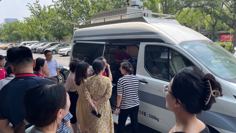 与会人员还实地观看审计车操作演示,团队成员林葛浩同学和王奕丹同学从车内相关设备的启动展示,到车外的卫星启动,多方面全方位展示了审计车的相关设备功能。