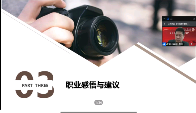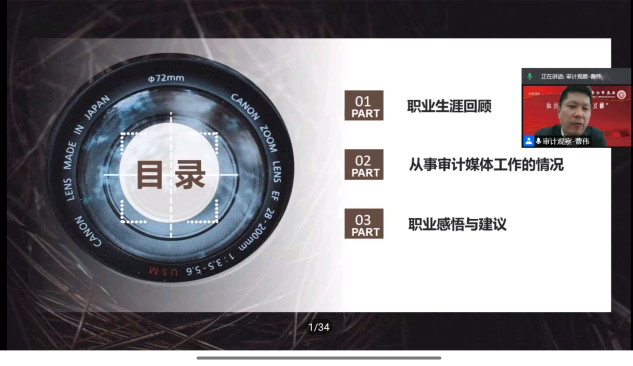 曹主任结合自身经历,从职业生涯回顾、从事审计媒体工作的情况、职业感悟与建议三方面开展讲座。