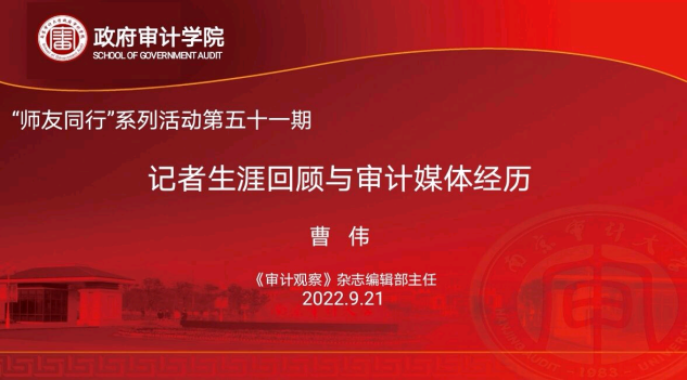 9月21日下午,政府审计在线博彩平台 在线上开展了“师友同行”系列第五十一期主题讲座——记者生涯回顾与审计媒体经历。本次讲座邀请到《审计观察》杂志编辑部主任曹伟作为主讲人,李兆东副院长主持讲座。曹主任有着十余年中央重点新闻单位工作经验,专注时政、宏观经济、区域经济等领域报道,2017年参与《审计观察》杂志的创刊工作并担任编辑部负责人,5年来期刊影响力和发行量稳步提升,杂志有着庞大的专业作者资源与读者群。