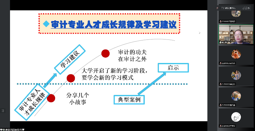 讲座中,贾老师结合具体案例指出,审计专业的同学们在初入审计工作单位时,由于接受了更为系统、全面的审计教育,会拥有一定的前期优势。但因其他基础知识不够完备,同学们也可能会面临后期发展乏力的困境。对此,贾老师指出:“审计的功夫在审计之外”,在正常接受学校安排的课程之余,同学们要适当了解其他与审计相关的学科知识,努力成为复合型人才,为以后的发展打下坚实的基础。争取成为“会做审计业绩”和“会带审计队伍”的人。