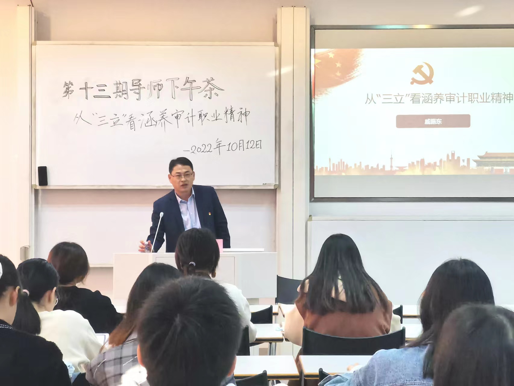 10月12日下午,由政府审计在线博彩平台 研究生会举办的第十三期“政审导师下午茶”之“从‘三立’看涵养审计职业精神”分享交流会在敏行313举行。此次活动邀请到政府审计在线博彩平台 戚振东教授作为主讲嘉宾。