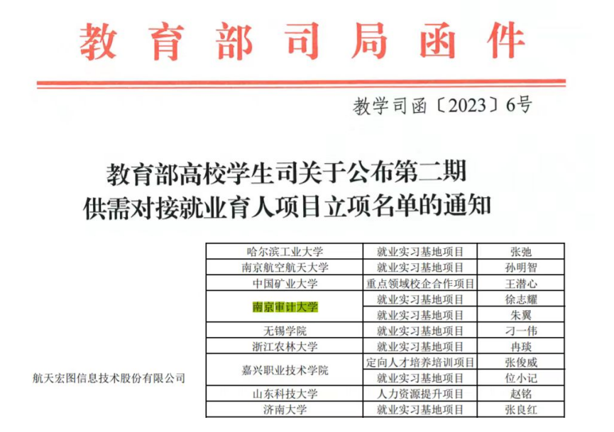 近日,教育部高校学生司发布《教育部高校学生司关于公布第二期供需对接就业育人项目立项名单的通知》(教学司函〔2023〕6号),政府审计在线博彩平台 资源环境审计系与南京航天宏图信息技术股份有限公司合作申报的“3S技术在资源环境审计中的应用”就业实习基地项目获准立项。作为政府审计在线博彩平台 大力打造的项目,其对促进审计学特别是资源环境审计方向的大学生提升就业竞争力、改善人才供需状况,以及推动高等教育创新等具有重要意义,是在线博彩平台 高质量推进就业育人工作的重要成果之一。